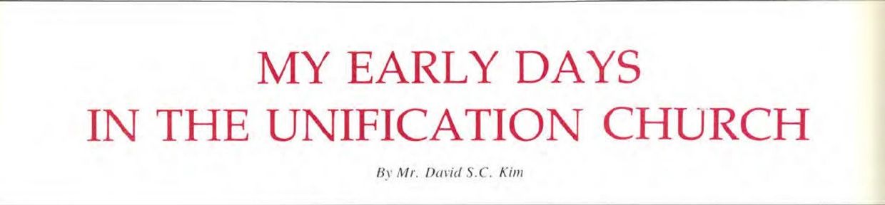 Listen, dear Sang Chul! I have been training you for 30 years, since the age of nine, to search for the truth through various religious experiences and groups. The time has now come; this is the place I wanted to lead you to. From now on, your new name is David, after King David who destroyed Goliath in the Old Testament. You will be going overseas for pioneer missionary work for this group. Then God left the body of Mrs. Ok. Without hesitation or doubt, I heard the message and accepted it, and bowed with gratitude and appreciation. With my previous spiritual experiences and my psychic ability, I knew God was talking directly to me, giving me instructions about my future mission for our True Parents. (Later, I was sent by Father to England as the first overseas missionary of our movement in August 1954, the same year as the inauguration of the Unification movement 30 years ago today. In 1959, I was sent to the United States as one of four pioneer missionaries.)