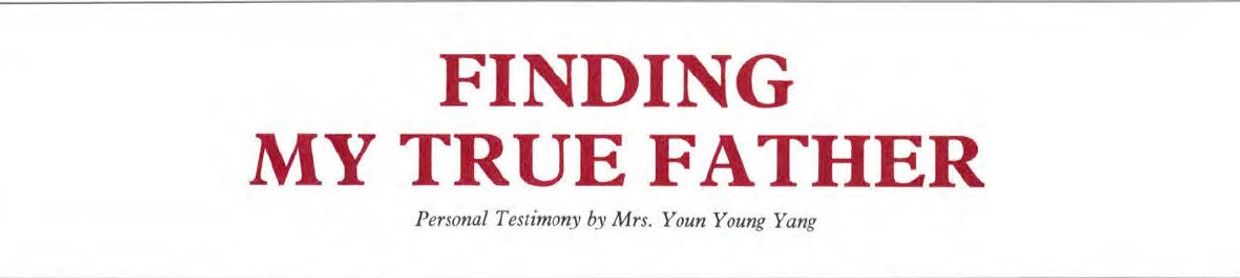 I couldn't get control of my heart, and I put my head in her lap and cried out, "Father! Father!" so long and so loud that the landlord came and opened the door to find out what was happening. Hyo Won made the excuse that we were praying fervently for a sick patient! After crying, "Father!" for a long time, Teacher, who was sitting beside me, suddenly looked like "Father" to me in my own mind. It came as a revelation. Suddenly I grabbed him and demanded to know why he hadn't told me himself that he had come with the mission of True Father. At this moment I felt like a little child who had found her father again after she had gone far away and then returned.