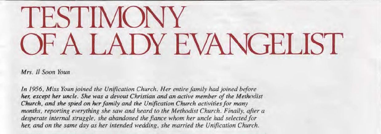 After three years of blessed wives' pioneering life, True Parents gave another direction to preach to 100 homes. I started with fasting and prayed after having planned and picked out a name list. Finally the time came to visit people. But because it was strange to visit people suddenly without having been acquainted with them, I decided to sell necessities of life which I bought with the money I was given on Hyo Jin Nim's birthday. "King of Kings my Lord, Heavenly Father, to preach to people I am going to sell things. Please work through these things and catch their hearts," I prayed. I sold them without profit door to door. The people responded well pleased that the price was very cheap. This way I visited people as usual and said hello to them whether they bought my things or not. Naturally then I became very intimate with the people. After 100 days had passed, I brought them the Divine Principle and the Bible instead of things to sell, and appeared as a preacher giving God's words. People who