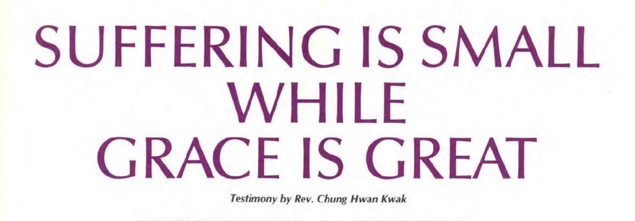 What joy and gratitude I felt when, early in the morning of October 1, my wife opened her eyes and looked at me! But the doctor warned us that our worries were not over. It was two weeks before she could speak, and 47 days until she could leave the intensive care ward and then later go home. I am grateful with tears to God simply for the fact that I am writing this testimony with my wife, who is alive. The support and encouragement of my brothers and sisters were a great solace for me. On the founda-tion of members' prayers, God's power brought her back from death. Nobody who knew her situation could deny the intervention of God. Even the doctor in charge said that it was God who saved her life. Many felt her recovery was "a living miracle of the 20th century" Again and again Father said, "Having pity on Chung Hwan, God saved Jung Eun's life" I became a living witness who had received the grace of God.
